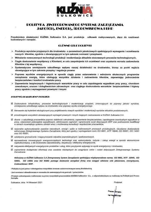 Moderne Maschinen, Mitarbeiter Erfahrung und eine sehr gute Organisation und Produktionskontrolle garantieren eine hervorragende Qualität der Schmiedeteile. Unser Unternehmen unterliegt auch einer regelmäßigen externen Aufsicht-wir haben Zertifikate ISO 9001:2015, ISO 14001:2015, ISO 50001:2011, PN-N-18001:2004, OHSAS 18001:2007, IATF 16949:2016.